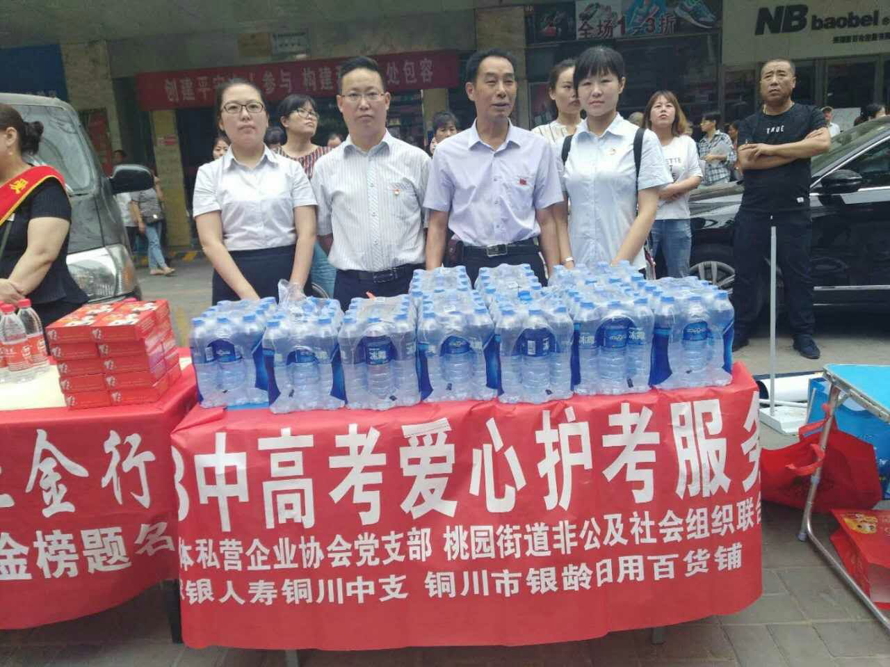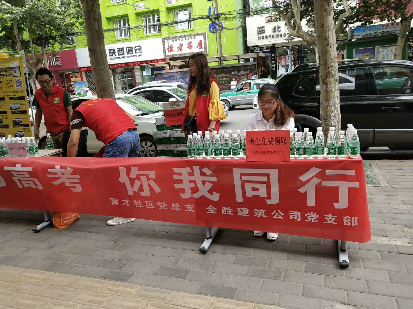 王益区个体私营企业协会党支部、全胜建筑公司党支部、桃园街道非公和社会组织联合党支部在矿务局一中考点设立高考爱心护考服务站,为考生提供免费饮用水,保险法等学习资料。