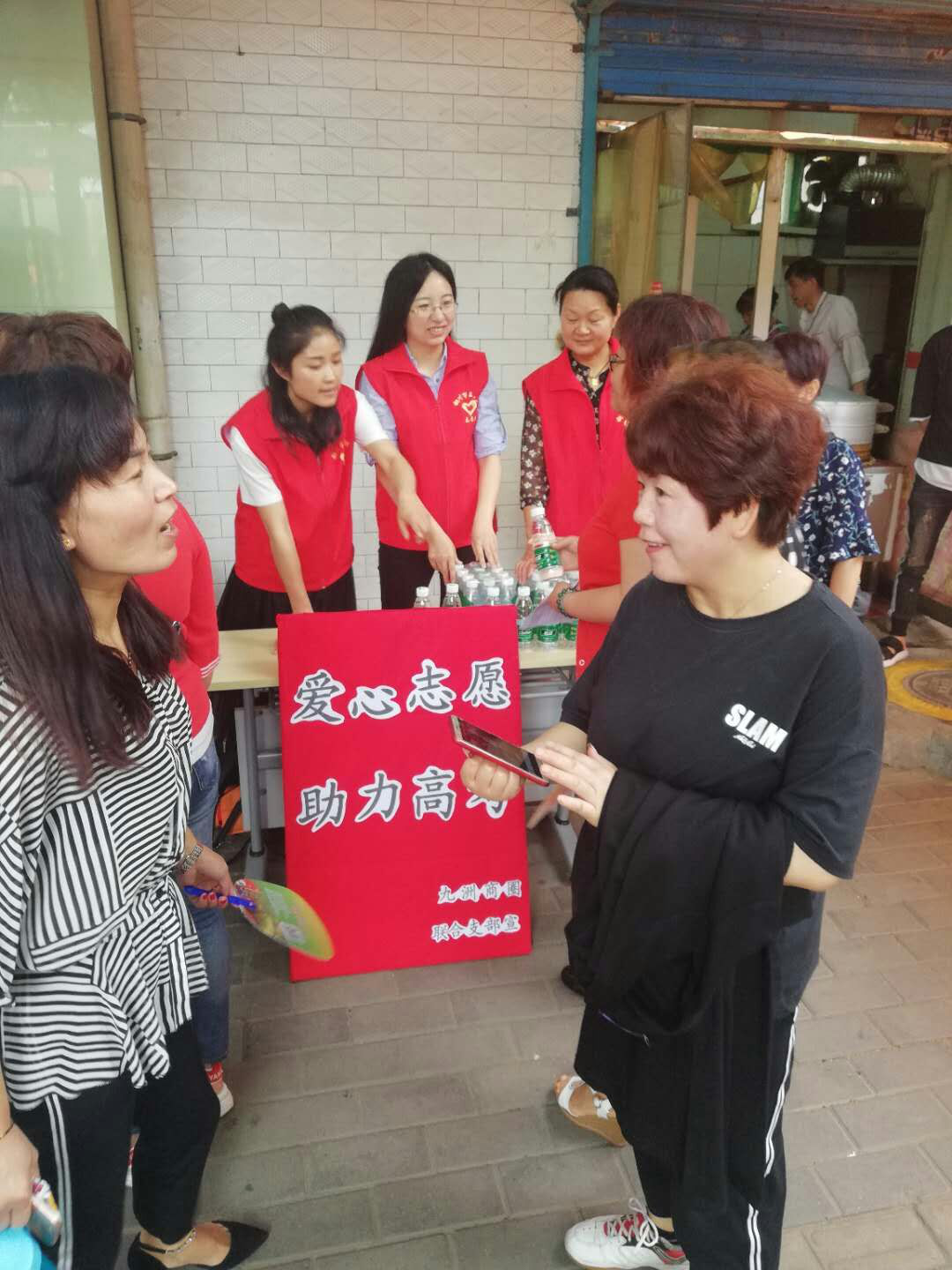 九洲国际商圈联合党支部在市二中考点为考生发放饮用水,为家长提供临时休息点,为巡警献爱心送温暖。
