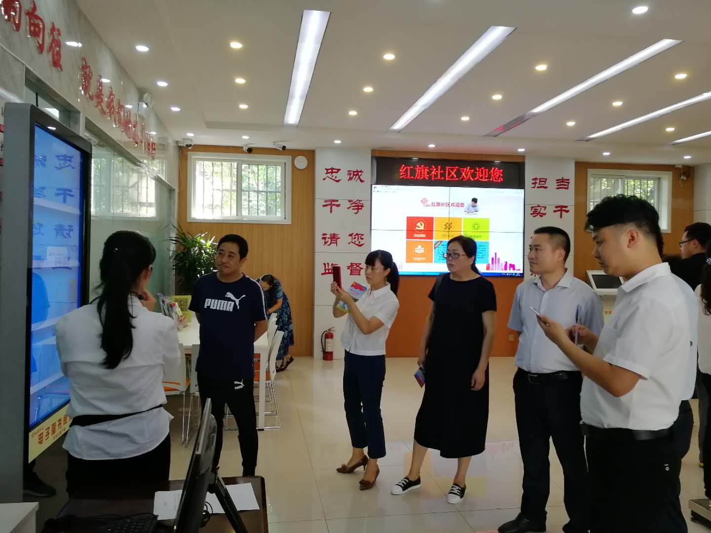 考察团在红旗社区观摩了智慧服务大厅、党组织活动阵地、日间照料中心等了解其建设和运营情况。听取了红旗社区党建工作经验介绍,就网格化管理、智慧化服务、共驻共建等方面工作进行了深入的探讨和交流。