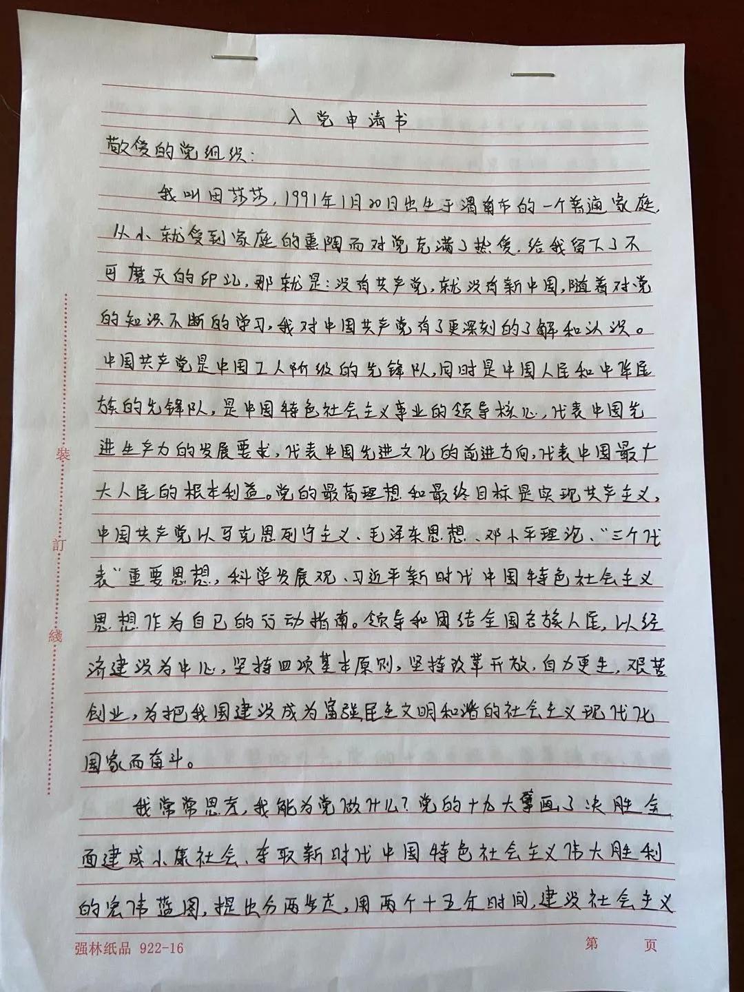 她说:“疫情就是命令,我做为护士长,有责任、有义务带这个头。”就这样,她穿上厚重的连体防护服、戴上口罩、帽子、护目镜和鞋套每天进出隔离区,为隔离人员量体温、测血压,进行医学观察,开展心理疏导,累计29人次。隔离点的物资十分紧缺,她自掏腰包,紧急购置医用口罩30个、手套10双、消毒液两瓶,帮助隔离点的同志们做好防护。在出现确诊病例后,隔离点陆续接收了两名特殊人员,一个2岁、一个9岁的小朋友,对两个小朋友,田莎莎更加精细的照顾,为她们送去玩具和学习用品,陪她们谈心玩耍,让她们在观察点感受到不一样的亲情。“我看到了很多优秀的党员,她们吃苦在前,享受在后,她们的精神激发了我加入党组织的决心和信心,我郑重的向党组织申请入党,请党组织考验我。”这是田莎莎在疫情防控期间入党申请书中写道的。
