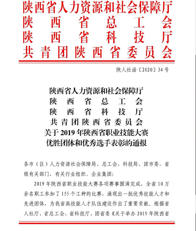 近日,陕西省人力资源和社会保障厅、陕西省总工会等4家单位联合下发了《关于2019年陕西省职业技能大赛优胜团体和优秀选手表彰的通报》,对在大赛中涌现出的优秀技能人才和先进团体进行表彰。此次大赛全省共10万余名职工参加了155个工种的比赛。其中,火凤凰荣获了技能大赛“团体银奖”,公司职工牛永楠在陶瓷滚压成形工工种比赛中表现出色,荣获“陕西省技术能手”称号。