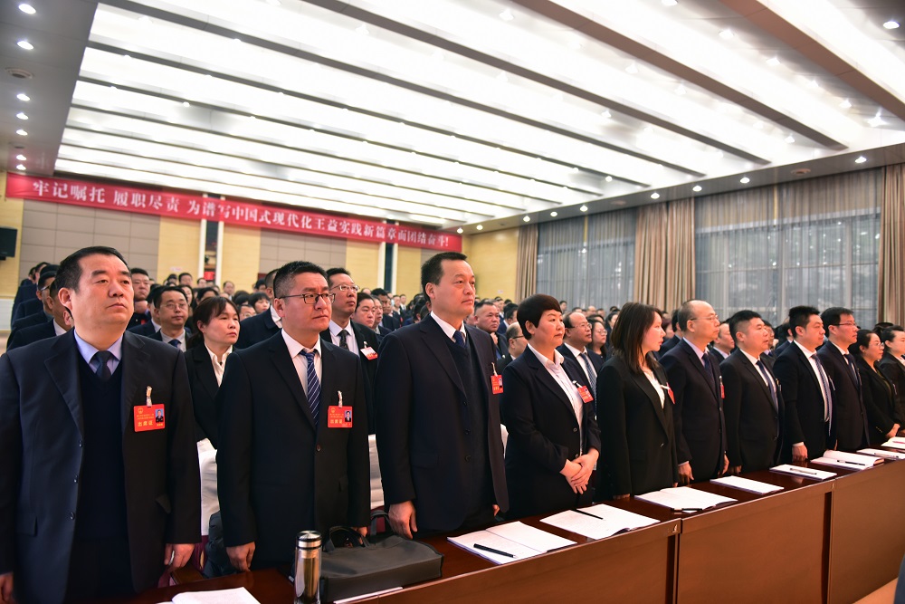 会场布置简洁,气氛庄严热烈。大会主席台上,红旗鲜艳、国徽高悬,主席台对面悬挂的红色横幅“牢记嘱托 履职尽责 为谱写中国式现代化王益实践新篇章而团结奋斗!”分外醒目、催人奋进。